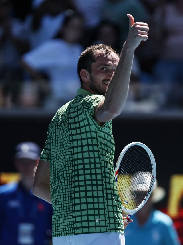 新华社照片,墨尔本(澳大利亚),2026年1月21日 1月21日,俄罗斯选手梅德韦杰夫在比赛中回球。 当地时间1月21日,在墨尔本进行的2026年澳大利亚网球公开赛男单第二轮比赛中,俄罗斯选手梅德韦杰夫3比1战胜法国选手阿里斯,晋级下一轮。 新华社记者 马平 摄